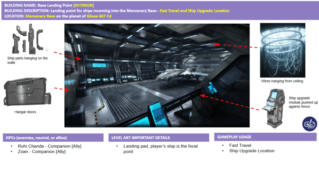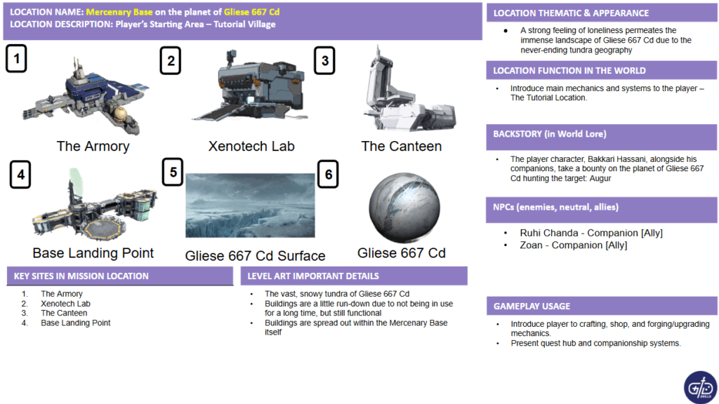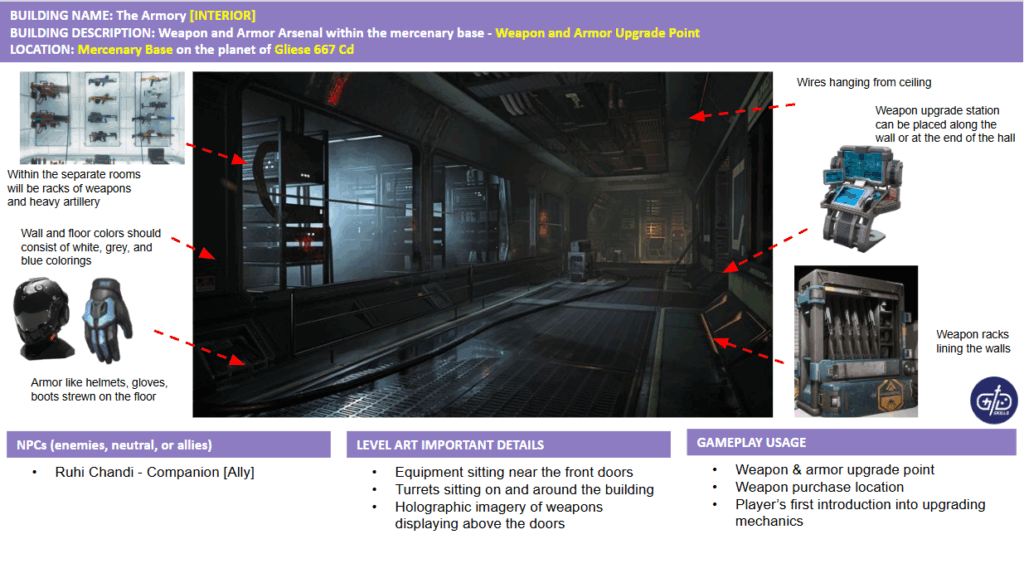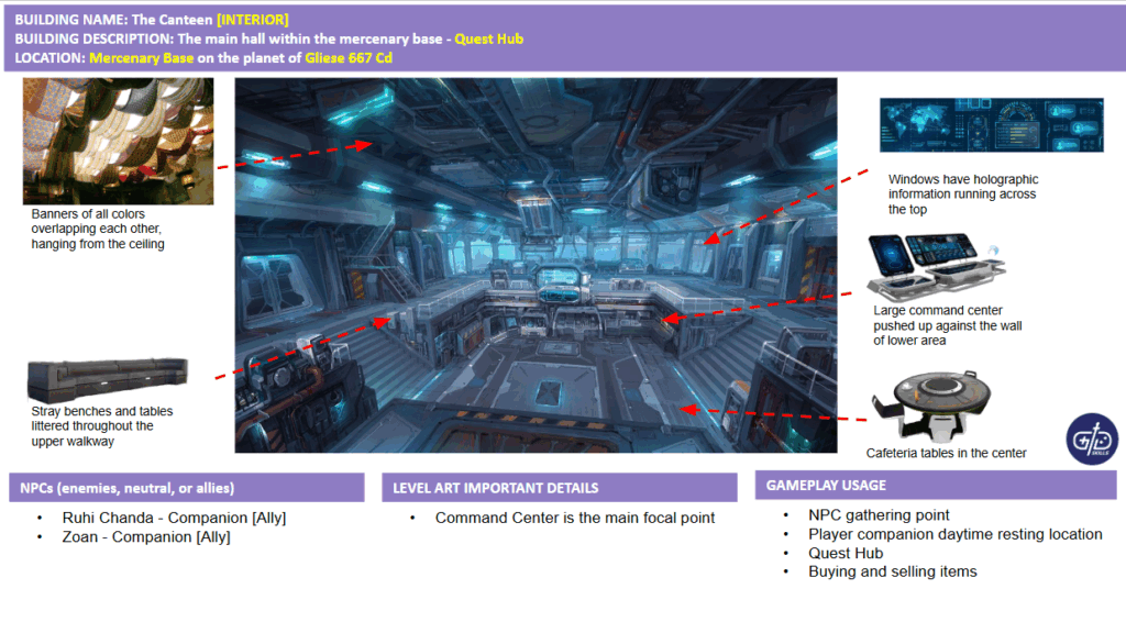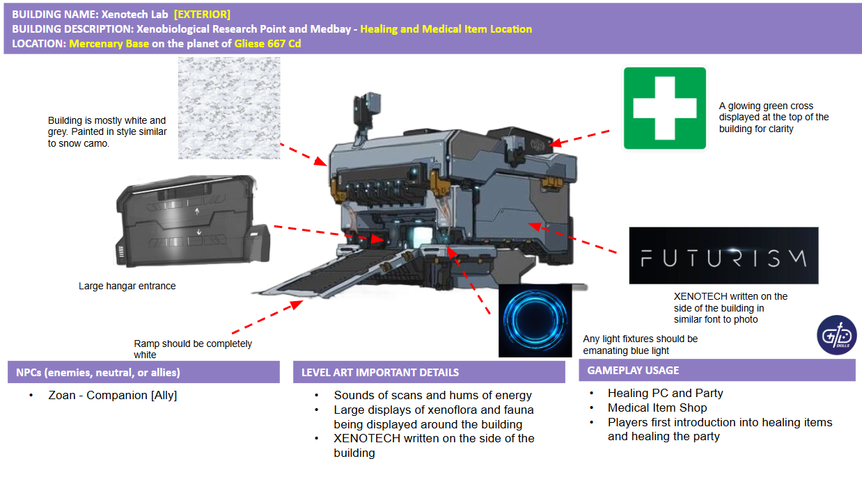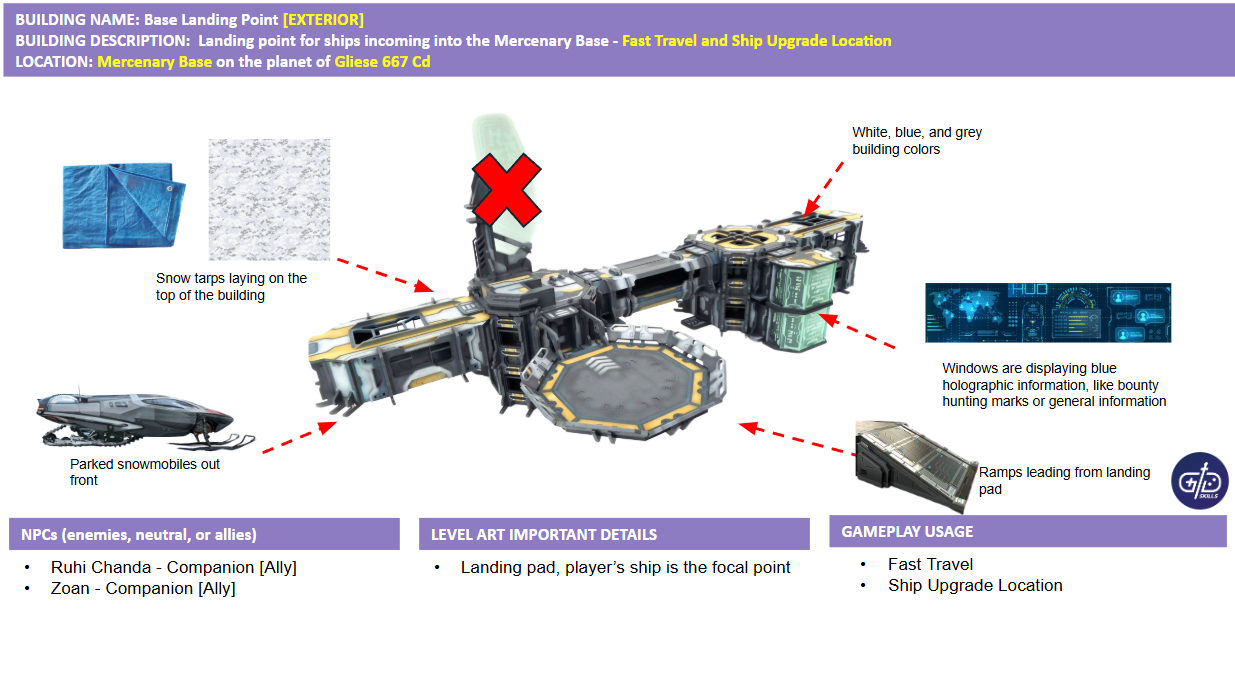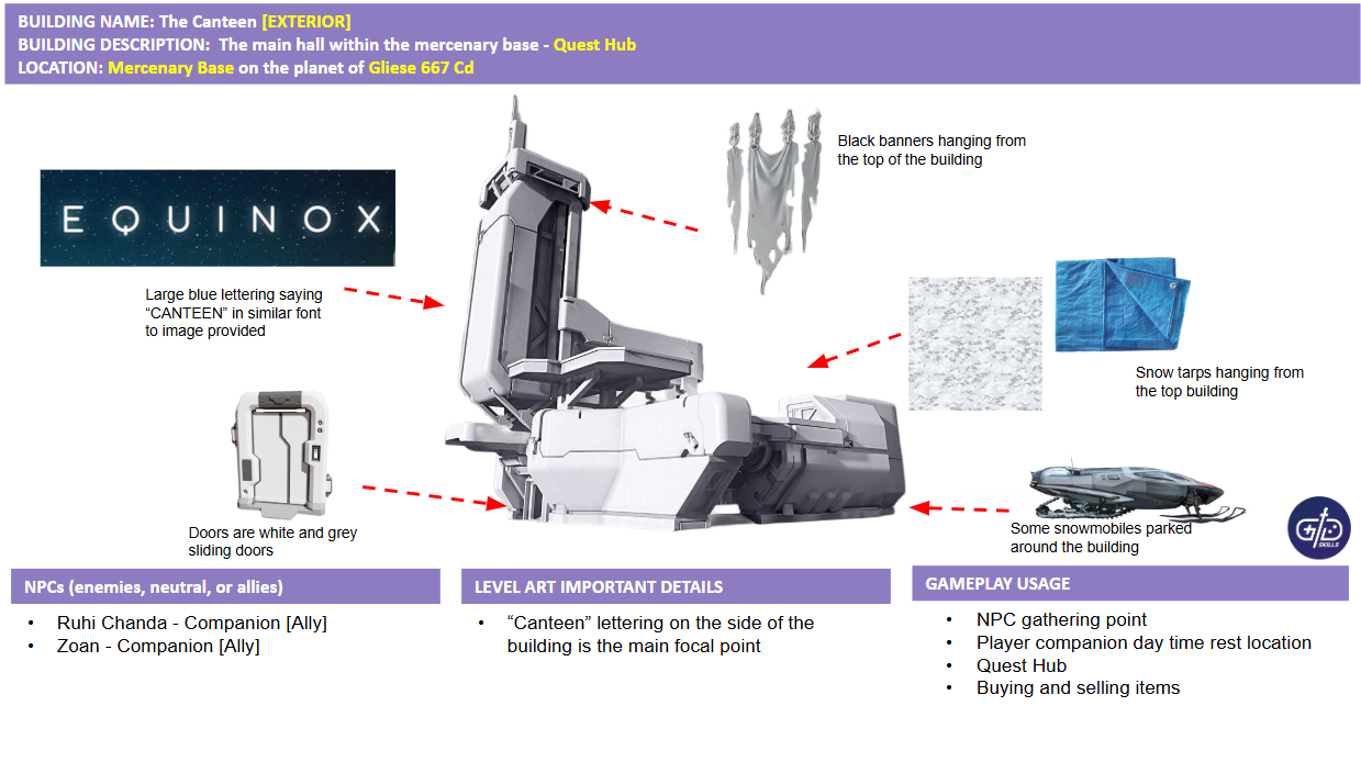 - Highlight key buildings of the Mercenary Base with item placements that resemble the building’s purpose to the player, as well as a connected list of gameplay purposes for the building itself.