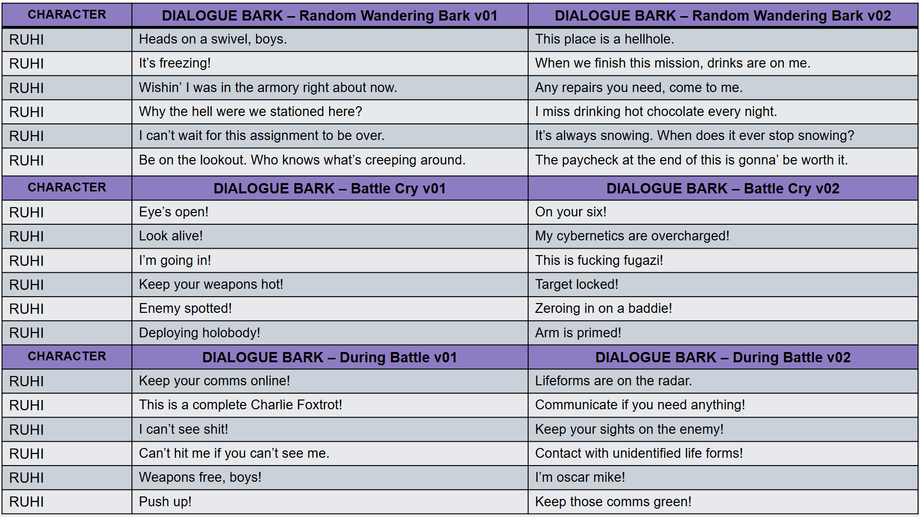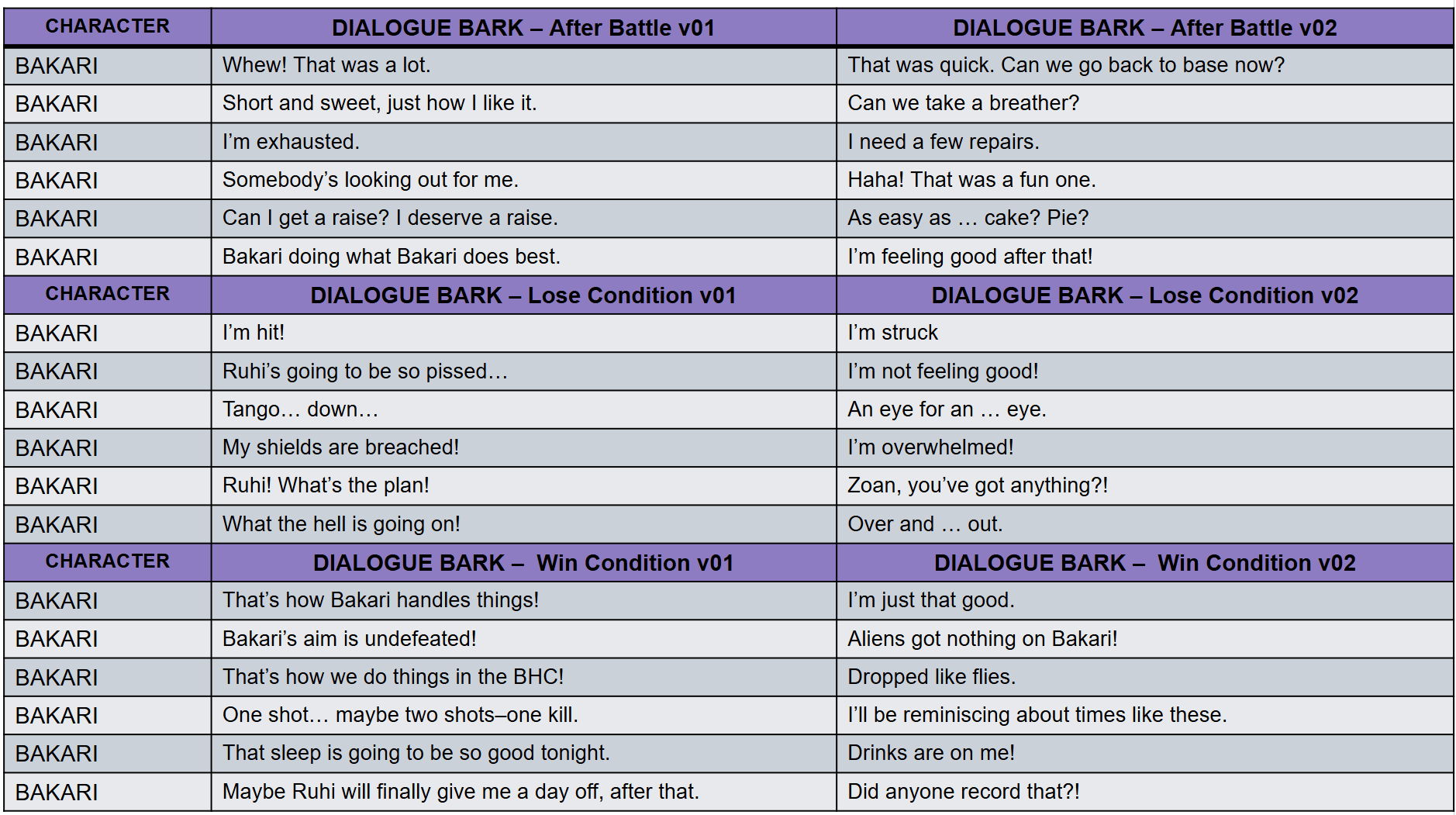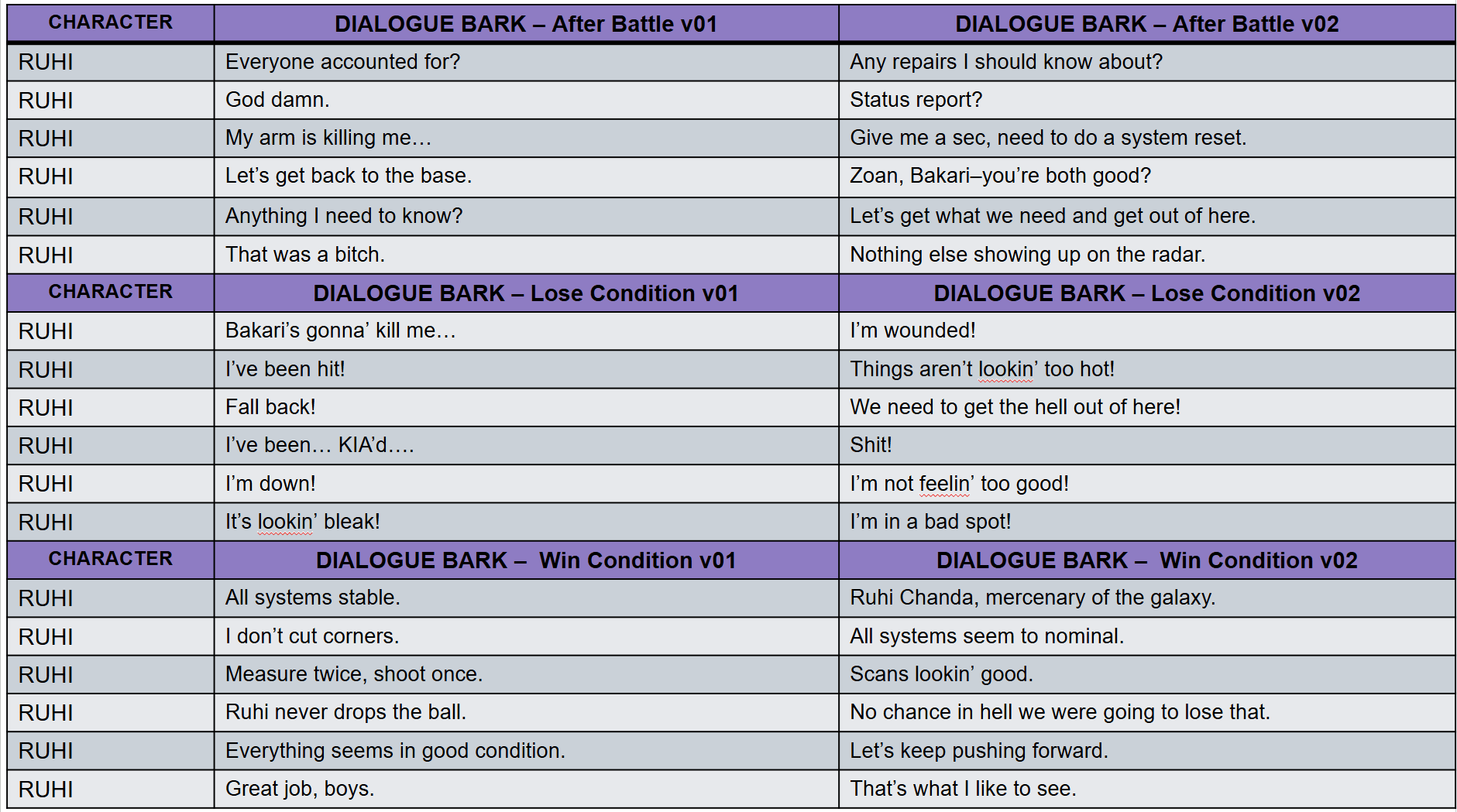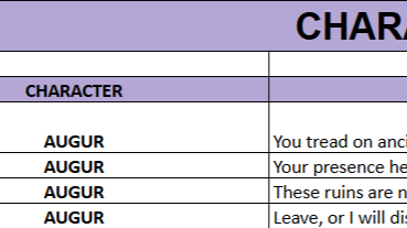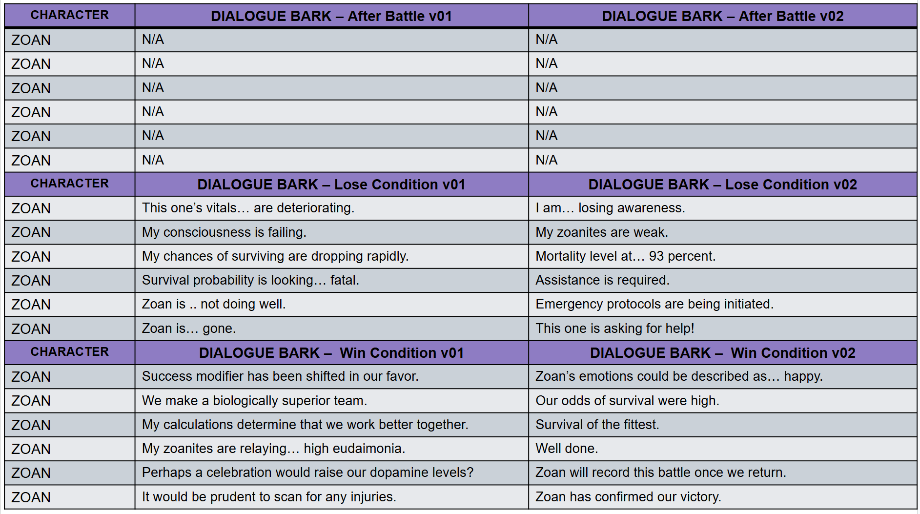 I created 4 voice-over documents for 1 player character, 2 NPC quest characters, and 1 enemy leader to provide thorough and detailed information for voice actors and to also ensure more refined voice recording sessions.