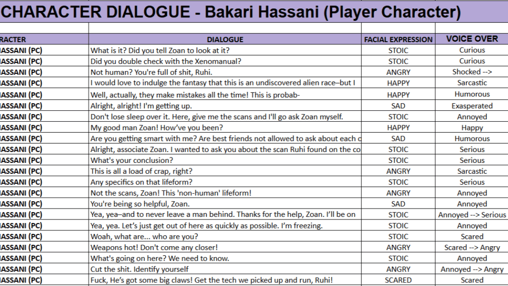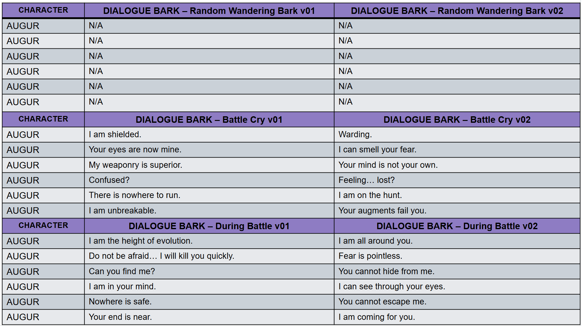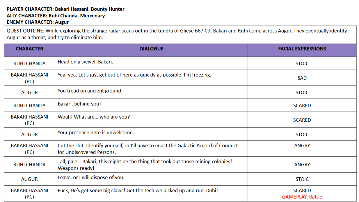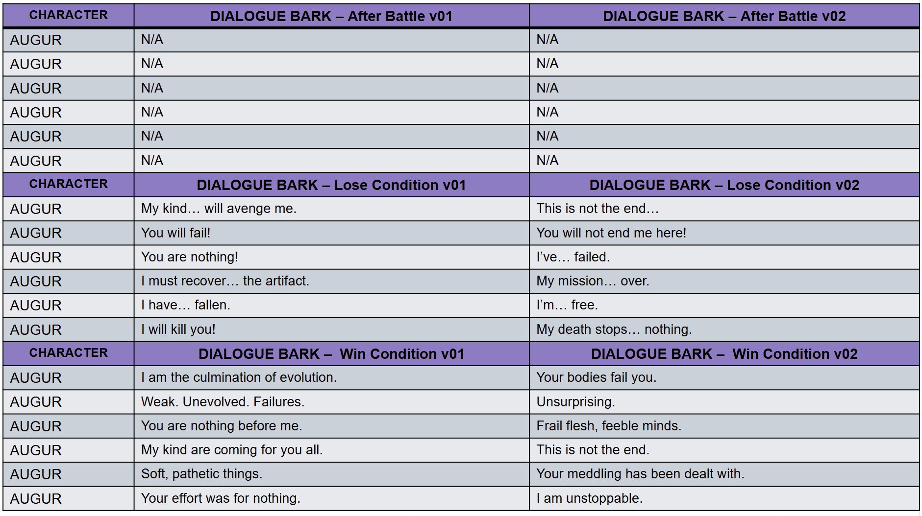 I created 4 voice-over documents for 1 player character, 2 NPC quest characters, and 1 enemy leader to provide thorough and detailed information for voice actors and to also ensure more refined voice recording sessions.