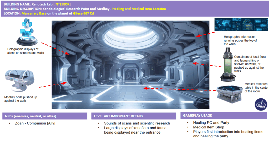 For the Xenotech lab, the player’s attention should be drawn to the many holograms displaying unique alien lifeforms. Also, in the middle of the room is a laboratory research table for the player to study new things they discover.