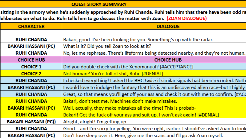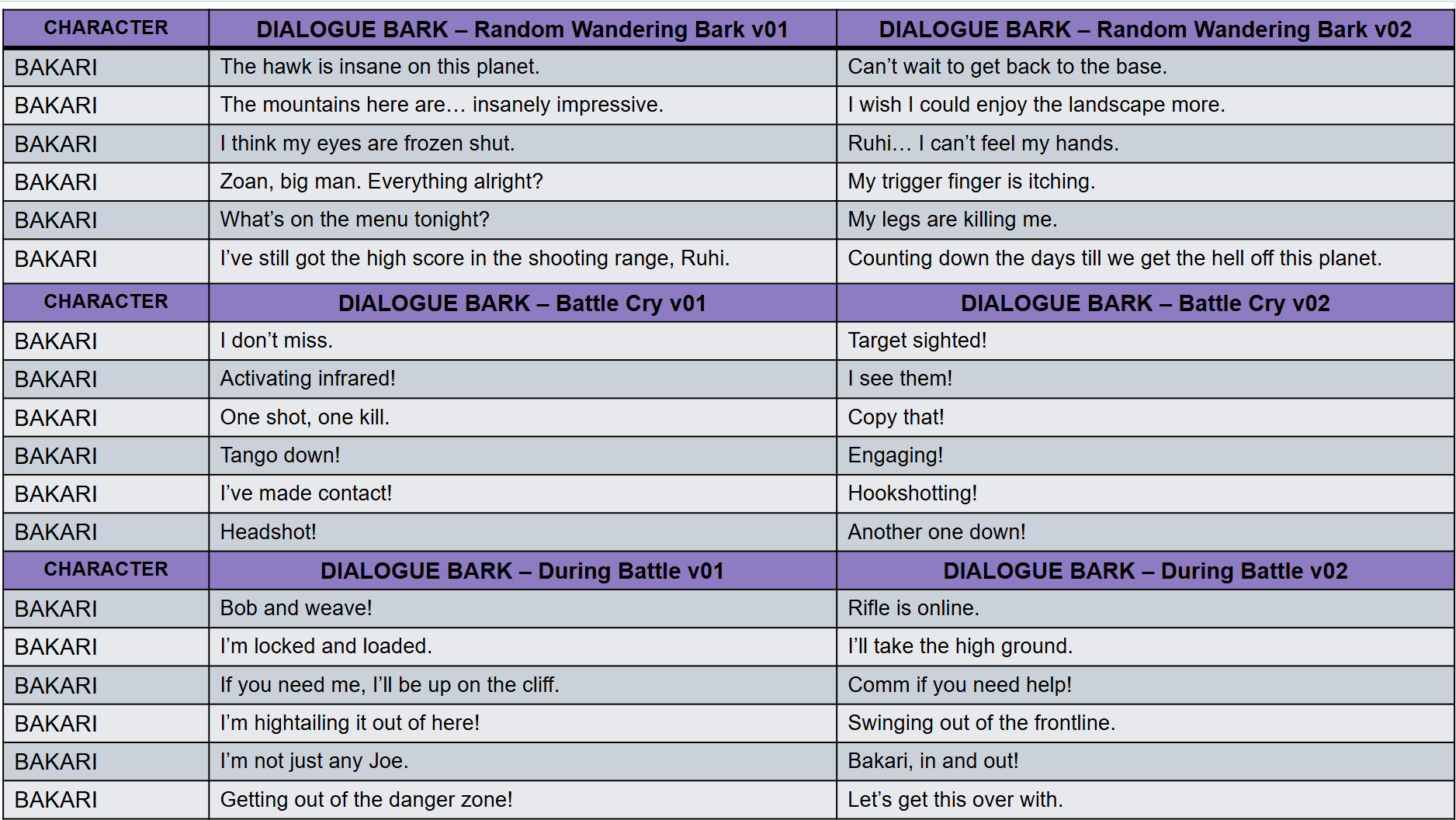 - All lines of dialogue for each character, along with scene details, dialogue context, and quest summaries, are provided to give situational and mood context for the voice actor.