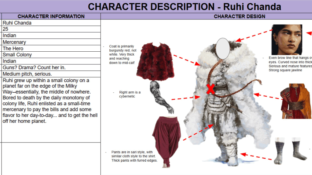 - Character design images, character backstories, personality notes, motivations, and vocal directions for each character.