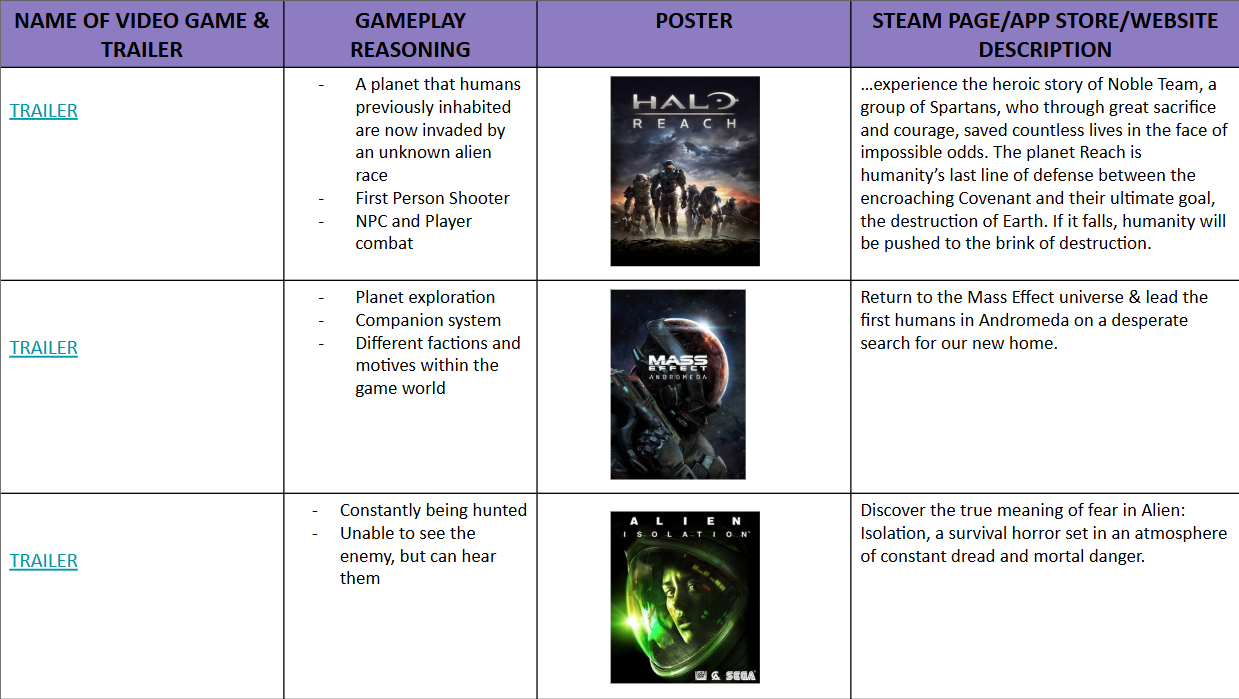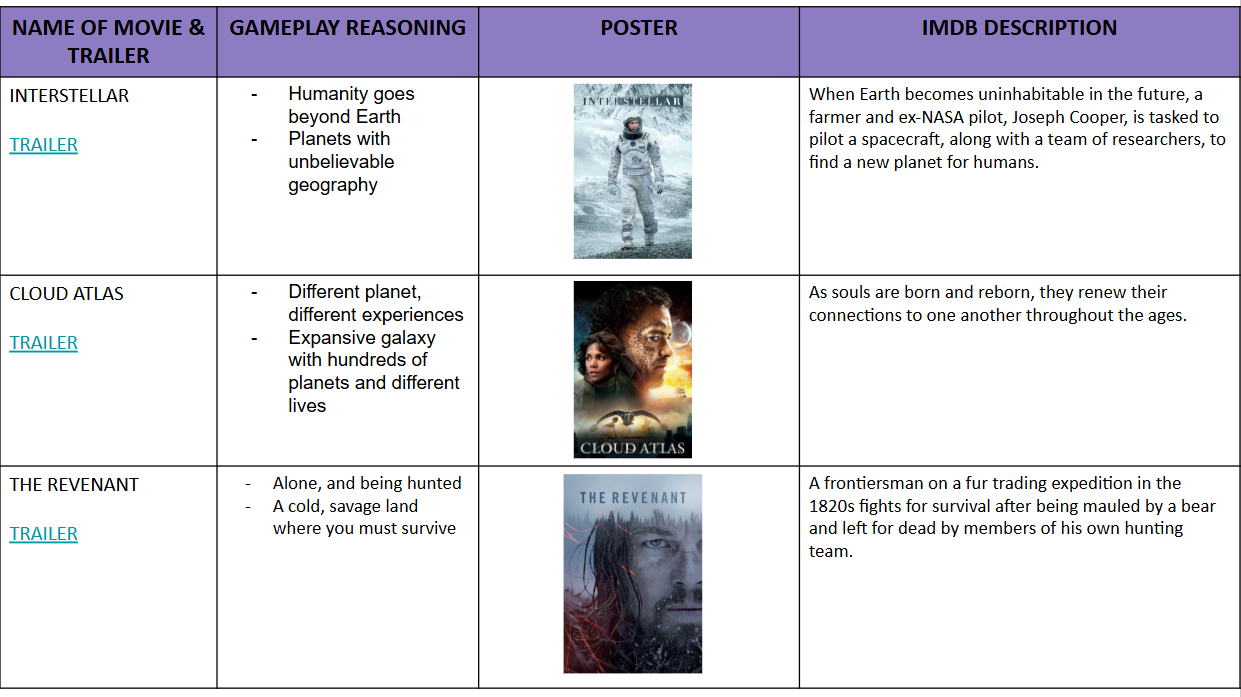 I conducted high-level research documentation to assist with determining the game’s popularity and help the marketing team do preliminary research with the target audience. To do so, I combined movies, shows, and comics that have narrative similarity. The document includes: