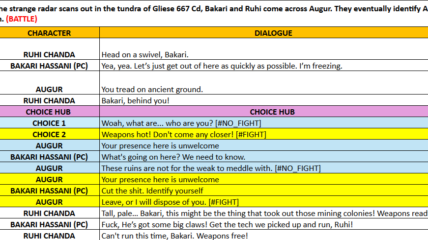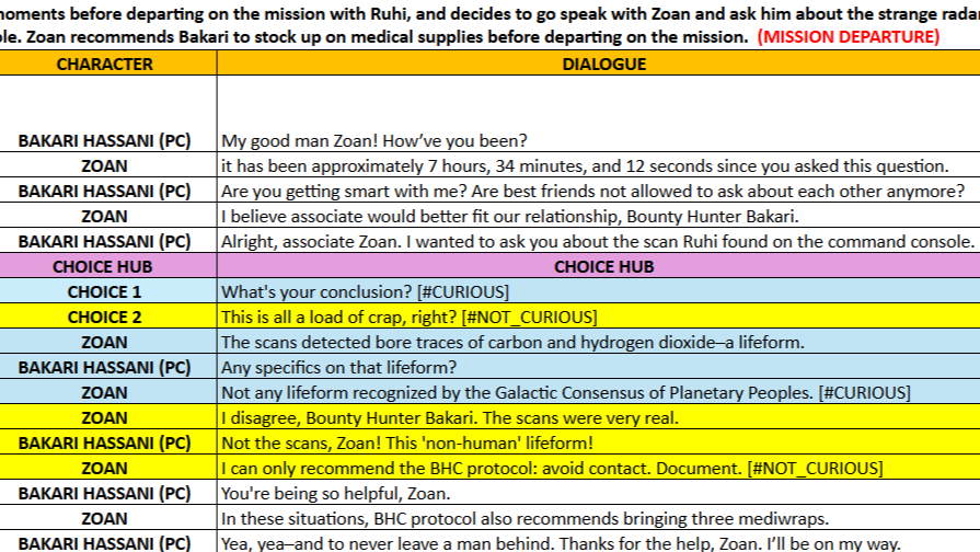 I designed branching dialogue threads that integrated variables and choices smoothly into gameplay. I did so by creating: